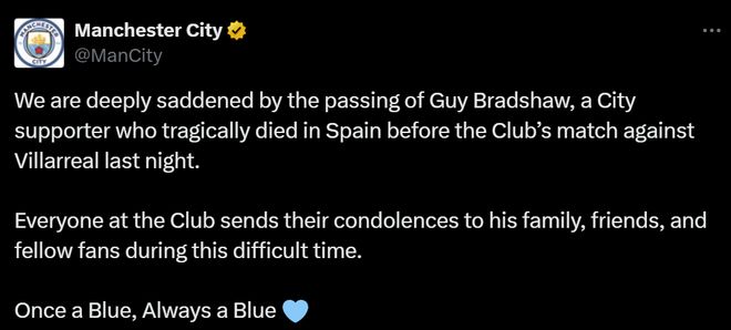 曼城队官方今天也通过社交媒体表示:“我们对曼城球迷盖伊·布拉德肖的去世深感悲痛,他昨晚在俱乐部对阵比利亚雷亚尔的比赛前在西班牙不幸去世。在这个艰难的时刻,俱乐部的每个人都向他的家人、朋友和同伴们致以慰问。一日蓝月,终生蓝月。”