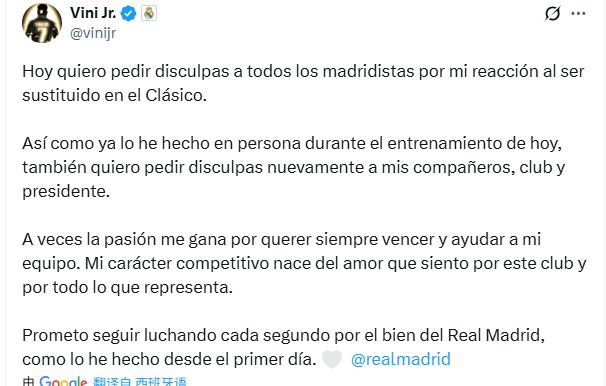 维尼修斯:“今天,我想向所有皇马球迷道歉,因为在国家德比被换下时我的反应。正如我今天在训练中已经当面道歉过一样,我也想再次向我的队友、俱乐部和主席道歉。”